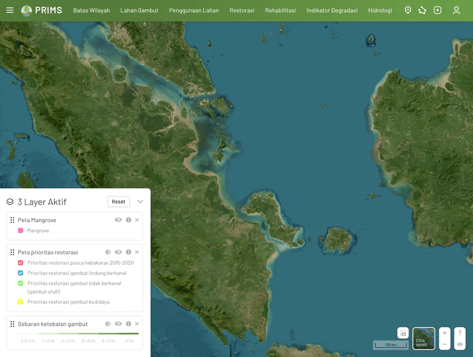 For the first time, the agency’s previously disparate data sets on hydrological units, peat canal locations, mangroves, fire hotspots, tree cover loss – and dozens more – were combined into one map-based interface, affording BRG staff unprecedented (and fully customisable) views of their operational theatre. PRIMS was the natural continuation of our ongoing work for Pantau Gambut, building on our familiarity with this type of ecosystem.
